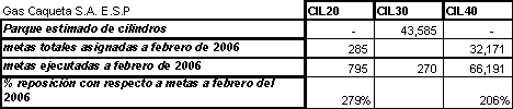 La metas totales asignadas a la sociedad GAS CAQUETA S.A. E.S.P. a febrero del 2006 son 285 cilindros de 20 libras y 32.171 cilindros de 40 libras de las cuales la empresa ha repuesto a febrero del 2006, 795 cilindros de 20 libras y 66.191 de 40 libras respectivamente. Lo anterior corresponde al 279% de reposición de cilindros de 20 libras y al 206% de reposición de cilindros de 40 libras a febrero del 2006.
