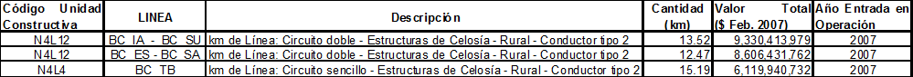 Si bien este es el procedimiento que se adelantó dentro de la actuación administrativa que culminó con la Resolución aquí impugnada, resulta indispensable precisar que la modificación presentada por CODENSA en relación con los valores de las Unidades Constructivas, fue el resultado de la forma como la CREG mediante la Resolución CREG 082 de 2007 decidió la solicitud de CODENSA de actualización del Costo Anual por el Uso de los Activos del Nivel de Tensión 4 por la entrada en operación del proyecto Banco de Compensación Capacitiva en 115 kV en la subestación El Sol.