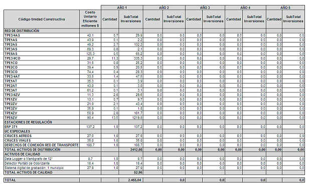 La empresa GAS NATURAL CUNDIBOYACENSE S.A. E.S.P., mediante comunicación con radicado CREG E-2008-008020 del 15 de septiembre de 2008, reportó a la CREG las proyecciones de demanda, las proyecciones de gastos de AOM de distribución y el programa de nuevas inversiones, clasificadas según el listado de unidades constructivas establecido en el Anexo No. 1 de la Resolución CREG 011 de 2003.