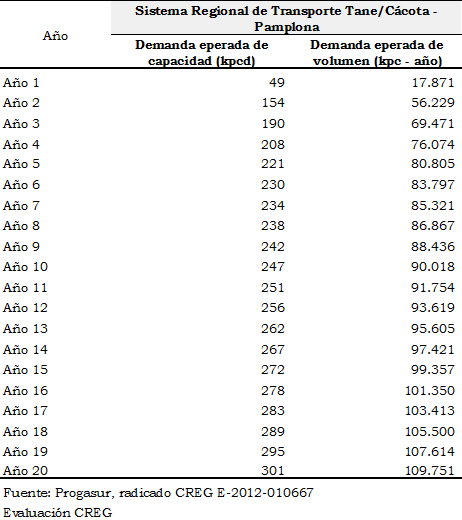 De acuerdo con lo establecido en el literal b del artículo 9 de la Resolución CREG 126 de 2010, mediante la Circular No. 021 de 2013 la Dirección Ejecutiva de la Comisión publicó las demandas esperadas de volumen y de capacidad presentadas por Progasur para el gasoducto Tane/Cácota – Pamplona.
