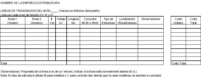 a) Activos eléctricos: Los transportadores deberán realizar un inventario de los activos que efectivamente utilizan en la prestación del servicio No deben incluirse, por ejemplo, líneas que están normalmente abiertas. independientemente del tiempo que estos lleven operando, asignándolos al nivel de tensión que sirven, siempre y cuando se trate de activos asociados a redes públicas. Para el caso del nivel de tensión I, el inventario se debe determinar a partir de una muestra representativa de dicho nivel. Este inventario se debe realizar de acuerdo con los formatos que se presentan en el Anexo No 2, los cuales deberán conservar las empresas para su eventual revisión por parte de la CREG. El resumen del inventario se debe presentar de acuerdo con los formatos que se incluyen en el Anexo No. 3, con el siguiente detalle: