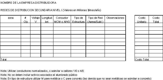 _ Activos del nivel I < 1 kV]: Transformadores de distribución con voltaje secundario perteneciente al nivel I; redes secundarias aéreas y subterráneas valoradas por calibre de conductor y otros equipos asociados al nivel (Pararrayos, cortacircuitos, etc.).
