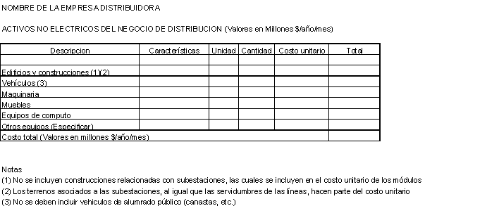 b) Activos no eléctricos: Corresponden a los activos no eléctricos requeridos en las actividades de Transmisión Regional y/o Distribución Local y son: Edificios, Vehículos y Maquinaria, Muebles, y Equipos de Cómputo. Estos deberán reportarse a la CREG en los formatos que se incluyen en el Anexo No. 3.