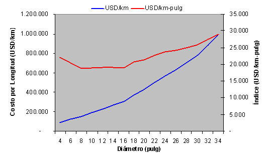 Así las cosas, se ha considerado que los costos de un proyecto de construcción de un gasoducto están directamente relacionados con la longitud, el diámetro y el espesor de la tubería, razón por la cual se utiliza para efectos de comparación un indicador de inversión que se expresa en US$/km-pulg. La siguiente gráfica se construyó con base en datos teóricos, tomados de “Pipeline Rules of Thumb Handbook”, que determinan el porcentaje de cambio de los costos cuando se pasa de un diámetro a otro, tomando como referencia el costo del gasoducto Barrancabermeja – Payoa, construido por Transoriente S.A. ESP (59 km en tubería de acero de 8 pulgadas).