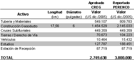 Para los rubros “Cruces Subfluviales” y “Estación de Recepción” se tomaron los valores reportados por PERENCO COLOMBIA LIMITED, teniendo en cuenta que estos corresponden a costos que son particulares del proyecto. En la siguiente tabla se presenta la comparación de los valores reportados en la solicitud tarifaria y los aprobados por la CREG.