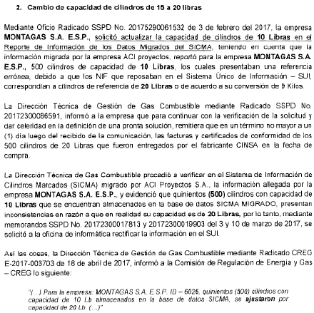 "En este sentido, es oportuno informarle que la dirección técnica de gestión de gas combustible mediante radicado SSPD No. 20172300268261 de 11 de abril de 2017, procedió a notificarle que se verifico en el sistema de información de cilindros marcados (SICMA) MIGRADO por ACI Proyectos S.A la información allegada por la empresa Montagas S.A. E.S.P y evidencio que quinientos (500) cilindros con capacidad de 10 libras que se encuentran almacenados en la base de datos SICMA MIGRADO, inconsistencias en razón a que su capacidad es de 20 libras, por lo tanto, mediante memorandos 20172300017813 y 20172300019903 de 3 y 10 de marzo de 2017, se solicitó a la oficina de informática rectificar la información en el SUI, solicitud que a la fecha de la presente comunicación ya se encuentra ejecutada.”