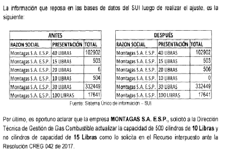Sobre el particular, la Superintendencia en respuesta al Auto de pruebas y en comunicación E-2017-005981 advierte que dicho cambio ya se encontraba incorporado en la información remitida a la CREG para efectos de la definición de la capacidad de compra, donde en el caso de Montagas dicho ajuste correspondía a que los 500 cilindros que se manifiestan correspondían a 20 libras y no a 10 como se tenía anteriormente. En relación con esto expone la Superintendencia: