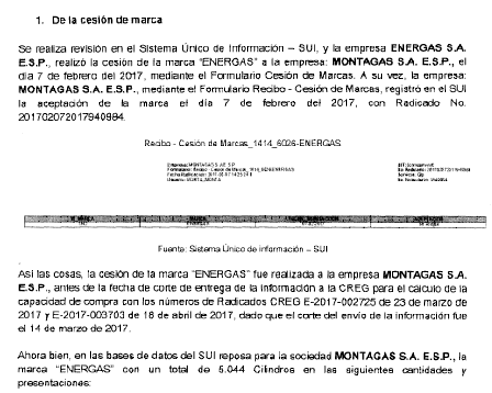 1. La Superintendencia advierte que existe una cesión de la marca Energas a Montagas en el Sistema Único de Información - SUI la cual fue realizada y validada previamente a la fecha de consulta de la información remitida a esta Comisión y con la cual se llevó a cabo la definición de la capacidad de compra, por lo que dicha marca se encuentra asociada a esta última.