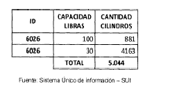 : | Cada uno de los diferentes códigos de presentación de envasado en cilindros, medidos en libras, de acuerdo con la información registrada desde el 2008 hasta octubre de 2012, por AIC proyectos y publicada en el SUI. |