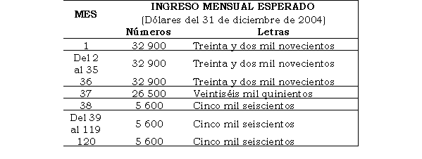 Artículo 1. Ingreso Mensual Esperado. El Ingreso Mensual Esperado -IME- para la Empresa de Energía de Bogotá S.A. E.S.P., por el diseño, suministro, construcción, montaje, operación y mantenimiento de dos bancos de compensación capacitiva de setenta y cinco (75) MVAr en la subestación Tunal en Bogotá, en el nivel de 115 kV, expresado en dólares de los Estados Unidos de América del 31 de diciembre de 2004, para 120 meses contados a partir del primer mes calendario completo de puesta en operación del proyecto, de conformidad con la propuesta seleccionada dentro de la Convocatoria Pública Internacional UPME-01-2004, es el siguiente: