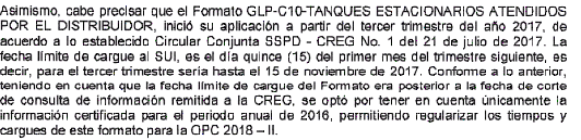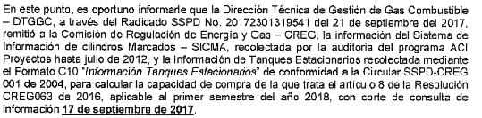 La primera información subida con esta nueva circular corresponde al tercer trimestre de 2017, los cuales fueron cargados y certificados en la plataforma del SUI, pero para el cálculo de la máxima capacidad de compra del periodo de enero a junio de 2018, se tuvo en cuenta el reporte certificado anualmente, lo cual afecta negativamente a la empresa, debido a las inversiones en Tanques que realizado durante el año. Por lo tanto, exigimos a la CREG atienda el debido reporte e incluya los tanques estacionarios reportados, ya que no consideramos justo, que desconozca las inversiones realizadas.