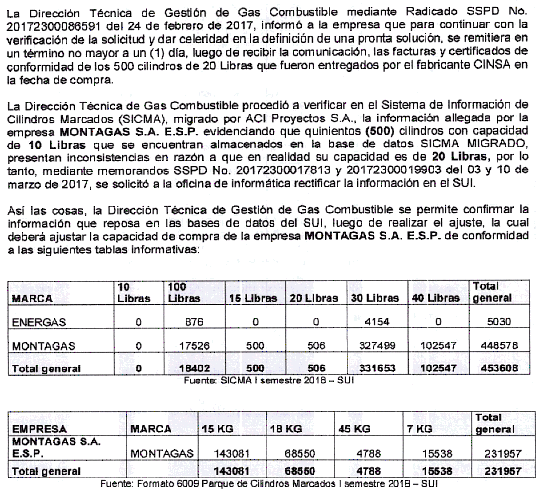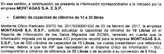 1. La Superintendencia advierte que para el caso de los 500 cilindros referenciados por Montagas en su recurso, su capacidad corresponde a 20 libras y no a 10 libras, para lo cual esto ya se encuentra confirmado en el Sistema Único de Información - SUI.