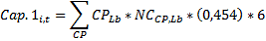 : | Capacidad de envase en cilindros, de acuerdo con la información registrada al SUI desde noviembre de 2012 hasta la fecha, para cada marca de propiedad del distribuidor i en el periodo t, medida en kilogramos, definida de la siguiente forma: |