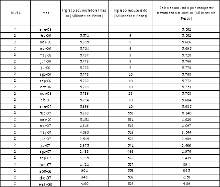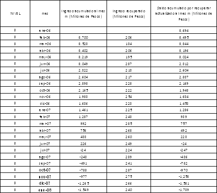 Que por lo anterior, ELECTROCOSTA S.A. E.S.P., presentó el balance entre el mes de enero de 2006 a diciembre de 2007, entre los ingresos dejados de percibir y los ingresos recuperados por la aplicación de los costos anuales y cargos máximos transitorios, durante el mismo periodo, con un saldo pendiente por recuperar según la empresa de $1.027.091.184;