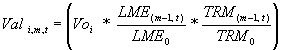 LME (m-1, t) : Precio promedio mensual del cobre, del zinc y del plomo correspondiente al mes m-1, del año t reportado por el London Metal Exchange, ($Us/Kg)