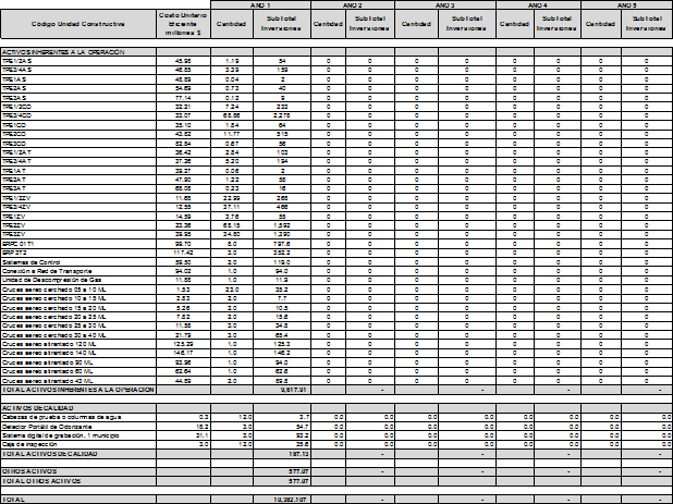 La solicitud tarifaria presentada por GASES DEL ORIENTE S.A. E.S.P. incluye las proyecciones de demanda, las proyecciones de gastos de AOM de distribución y el Programa de Nuevas Inversiones, clasificadas según el listado de unidades constructivas establecido en el Anexo No. 1 de la Resolución CREG 011 de 2003.