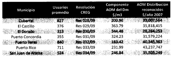Sin embargo, consideramos que este no es el caso de los mercados relevantes La Unión – EPM (Res. CREG 054/09), El Retiro-EPM (Res. 055/09), Cotorra-Surtigas (Res. 095/09) y La Unión-Surtigas (Res. 154/09), debido a que los gastos anuales aprobados en estos mercados están en el rango de 12 a 26 millones (precios de diciembre de 2002), equivalentes a un rango entre 16 y 32 millones de pesos (precios de diciembre de 2010), los cuales consideramos insuficientes para atender los gastos de la actividad de distribución en un municipio.