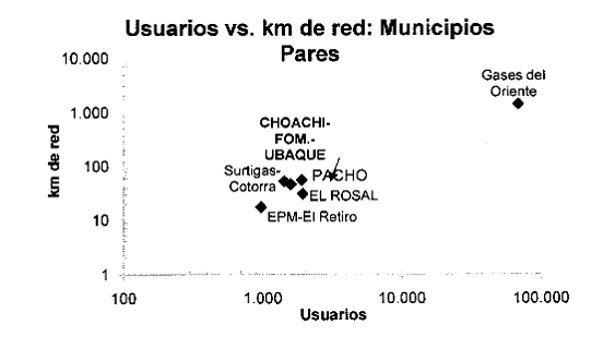 En primera medida, se realizó una comparación entre los usuarios promedio de los primeros cinco años, y los kilómetros de red promedio en ese mismo periodo. Se halló que Gases del Oriente, muestra valores que no son comparables con las demás empresas pares del grupo arrojado por el modelo DEA. En el gráfico siguiente se observa dicho alejamiento (nótese la escala logarítmica de los ejes, que fue necesaria para poder mostrar la magnitud de las diferencias):