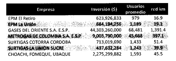 • Excluir de la base de datos de las empresas utilizadas en el modelo DEA, la información de mercados que nunca se ejecutaron por una u otra razón: EMPITALlTO, Servigas Coyaima, Gases de Bolívar. Igualmente, solicitar la revisión de la información de AOM de la empresa Gases del Oriente incluida en la base de datos actual, por el alto número de empresas sobre las que impone eficiencia.