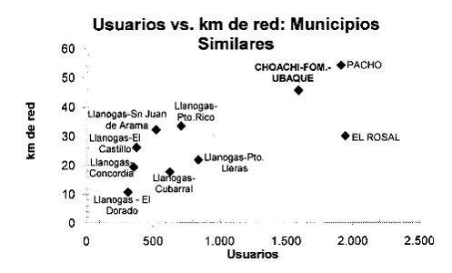 Como se puede observar, este conjunto se encuentra establecido en un rango mucho más enfocado, el cual está entre los 300 y los 2.000 usuarios, y no un rango desproporcionado como el visto en el primer caso, en donde los expedientes de Choachí, Fomeque y Ubaque, junto con los expedientes de EPM y Surtigas, se ubican entre los 1.000 y 2.000 usuarios, pero Gases del Oriente tiene alrededor de los 70.000 usuarios abriendo el rango de comparación de manera poco razonable.