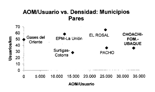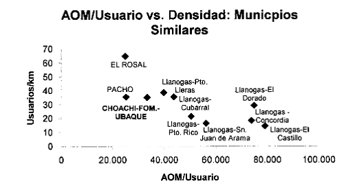 Con base en el análisis anterior, se desarrolló un estudio de los ratios de gastos de AOM/Usuario y Usuarios/kilómetro de red (densidad), lo cual arrojó el siguiente resultado:
