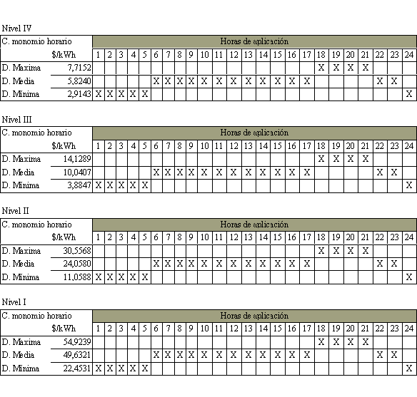 Artículo 2°. Cargos monomios horarios. Los cargos monomios horarios por uso del Sistema de Transmisión Regional y/o Distribución Local operado por la Centrales Hidroeléctricas de Caldas S.A.-E.S.P., serán los siguientes, a pesos de diciembre de 1996: