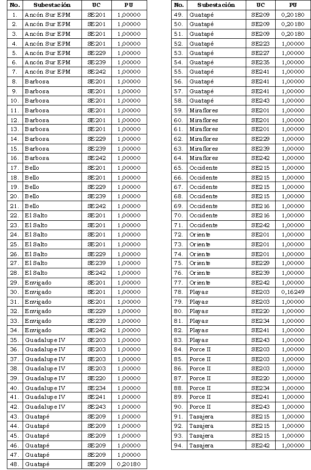 Para cada activo se indica el porcentaje (PU) de la Unidad Constructiva (UC) remunerado al Transmisor mediante cargos por uso.