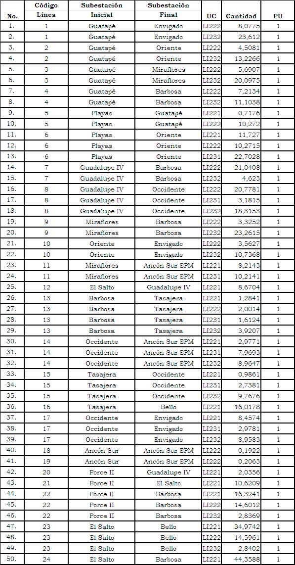 Empresas Públicas de Medellín E.S.P. reportó a la CREG la base de activos eléctricos del STN que se encuentran en operación clasificados según el listado de unidades constructivas que aparece en el Capítulo 3 del Anexo General de la Resolución CREG 011 de 2009.