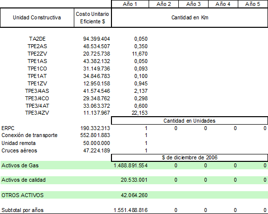Que la solicitud tarifaria presentada por Gas de Santander S.A. ESP. incluye las proyecciones de demanda, las proyecciones de gastos de AOM de distribución y el Programa de Nuevas Inversiones, clasificadas según el listado de unidades constructivas establecido en el Anexo No. 1 de la Resolución CREG 011 de 2003;
