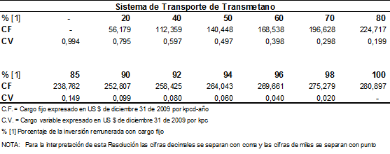 Artículo 5. Cargos Regulados de Referencia para la Remuneración de los Costos de Inversión. Para remunerar los costos de inversión para el sistema de transporte definido en el artículo 1 de esta Resolución, de conformidad con lo establecido en la Resolución CREG 126 de 2010, se aprueban las siguientes parejas de cargos regulados: