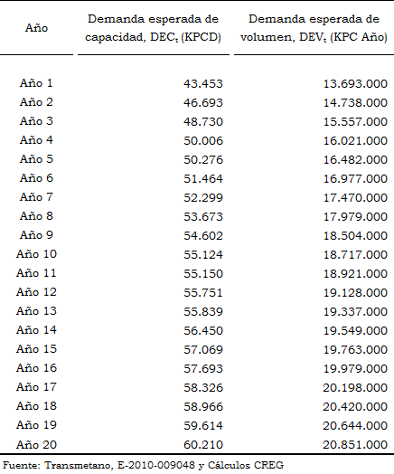 Artículo 4. Demandas Esperadas de Volumen y Capacidad. La demanda esperada de volumen, DEVt, y la demanda esperada de capacidad, DECt, que sirvieron de base para el cálculo de los cargos que aquí se aprueban, de conformidad con los criterios generales establecidos por la Comisión de Regulación de Energía y Gas, son las presentadas en el Anexo 3 de esta Resolución.