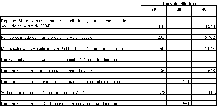 Es así que la programación de las metas que se encuentra contenida en la Resolución 002 de 2005 se realizó con base en la información de ventas reportadas al SUI por cada uno de los distribuidores durante el segundo semestre de 2004 y utilizando los criterios y metodología detallados en la Resolución. De lo anterior se observa que las metas tienen relación directa con el parque de cilindros que opera cada uno de los distribuidores. En la práctica se ha demostrado que el modelo de estimación de metas que ha utilizado la CREG para estimar las metas individuales es consistente y que las empresas pueden programar incluso metas superiores a las mínimas establecidas sin tener problemas operativos.