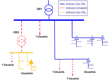 En este caso, los activos tenidos en cuenta para la remuneración del OR1 son todos aquellos que son usados por los usuarios en conjunto sin considerar los Activos de Conexión de los usuarios conectados a su sistema. Los cargos por uso del sistema del OR1 se calculan considerando que todos los usuarios del mismo pagan cargos por uso, incluido el sistema del OR2.