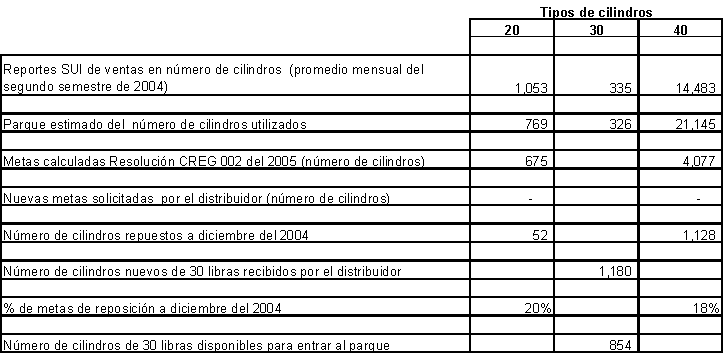 Es así que la programación de las metas que se encuentra contenida en la Resolución 002 de 2005 se realizó con base en la información de ventas reportadas al SUI por cada uno de los distribuidores durante el segundo semestre de 2004 y utilizando los criterios y metodología detallados en la Resolución. De lo anterior se observa que las metas tienen relación directa con el parque de cilindros que opera cada uno de los distribuidores. En la práctica se ha demostrado que el modelo de estimación de metas que ha utilizado la CREG para estimar las metas individuales es consistente y que las empresas pueden programar incluso metas superiores a las mínimas establecidas sin tener problemas operativos.
