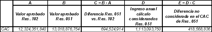 El Costo Anual resultante de sumar los $1.113.093.750 reconocidos en los considerandos de la Resolución 051/06, a los $12.325.351.840 reconocidos en la Resolución 102/05, es de $13.438.445.590 y no de $13.018.876.754 como fue estipulado en el artículo 20 de la parte resolutiva de la Resolución 051 de 2006. Lo anterior significa que en el ingreso anual aprobado se estaría dejando de reconocer $418.568.836 (pesos de diciembre de 2001), correspondientes a activos de conexión al STN, lo que, reiteramos, no corresponde al análisis realizado en los considerandos de la resolución.