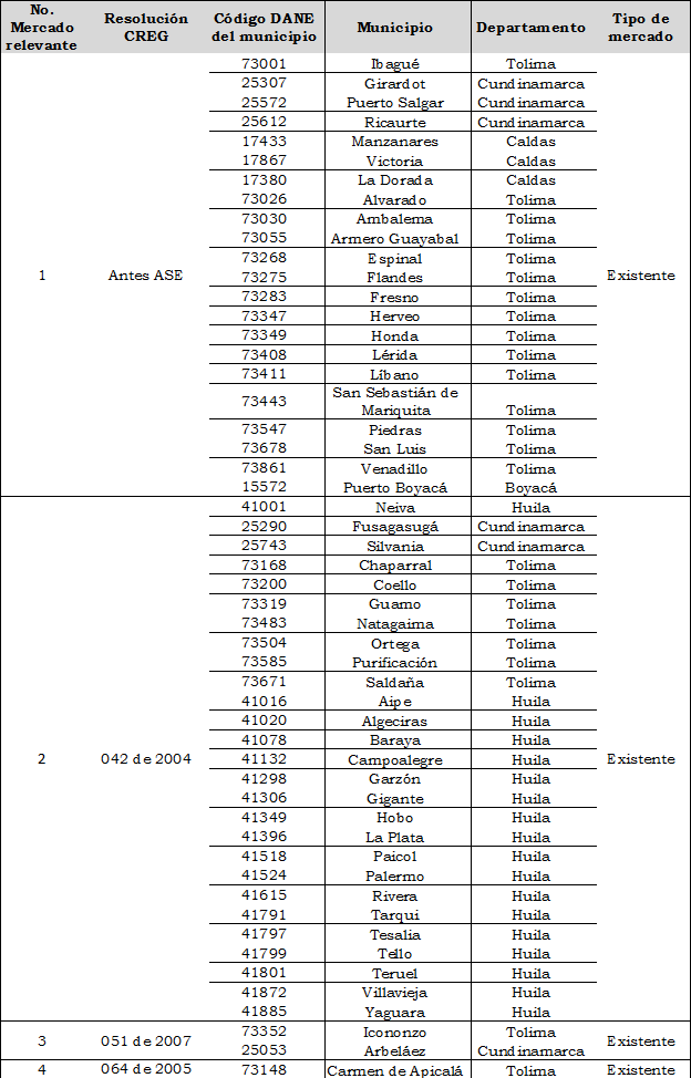 · Resolución CREG 042 de 2004: Municipios de Tarqui, Algeciras, Hobo, Teruel, Rivera, Gigante, Tello, Baraya, Palermo, Villavieja, Tesalia, Fortalecillas, Betania, Paicol, Neiva, Yaguara, Guacirco, Aipe, El Juncal, San Francisco, Campoelegre, La Plata, Garzón, El Caguán, Pacarni en el departamento del Huila; El Guamo, Natagaima, Coello, Gualanday, Saldaña, Purificación, Ortega y Chaparral en el departamento del Tolima; Silvania y Fusagasuga en el departamento de Cundinamarca.