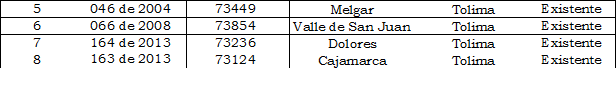 73854 | Valle de San Juan | Tolima |  | 73678 | San Luis | Tolima |