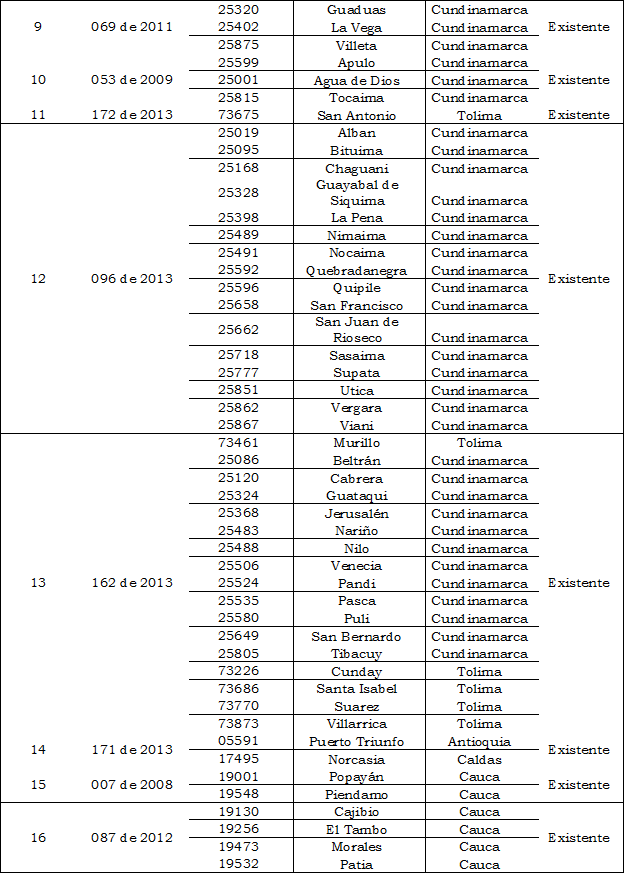 · Resolución CREG 162 de 2013: Municipios de Pandi, Nilo, Pulí, Jerusalen, Venecia, Nariño, Pasca, Beltrán, Cabrera, san Bernardo, Tibacuy y Guataquí en el departamento de Cundinamarca; Suárez, Cunday, Villarrica, Murillo y Santa Isabel en el departamento del Tolima.
