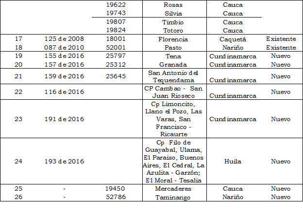 25019 | Albán | Cundinamarca |  | 19622 | Rosas | Cauca |