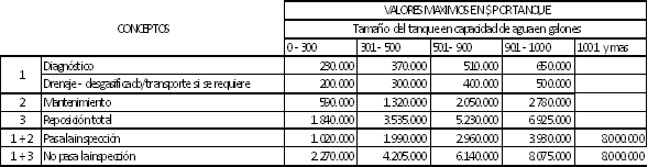a. Para los tanques estacionarios con capacidad individual igual o menor a 1000 galones de agua, que estén siendo utilizados para prestar el servicio público domiciliario de GLP, se pagará la totalidad de los costos sin superar en ningún caso los valores estimados de inspección, mantenimiento o reposición, según el caso, que se indican a continuación.