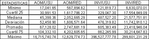 Antes de llevar a cabo el análisis DEA en la definición de estos costos eficientes, al interior de la Comisión se llevó a cabo un análisis exploratorio de los datos con el fin de identificar los valores extremos. Este análisis no se efectuó sobre las variables iniciales, sino sobre los diferentes índices calculados a partir de las variables de entrada y salida del modelo utilizado, así: AOM/usuario, AOM/red, Inversión/Usuario e Inversión/Red.