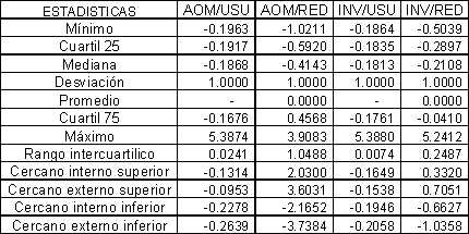 Para la determinación de los valores extremos, se calculan las estadísticas básicas para los índices normalizados, estas estadísticas nos dan los soportes para elaborar el diagrama de caja (BoxPlot) y tomar las decisiones del caso.