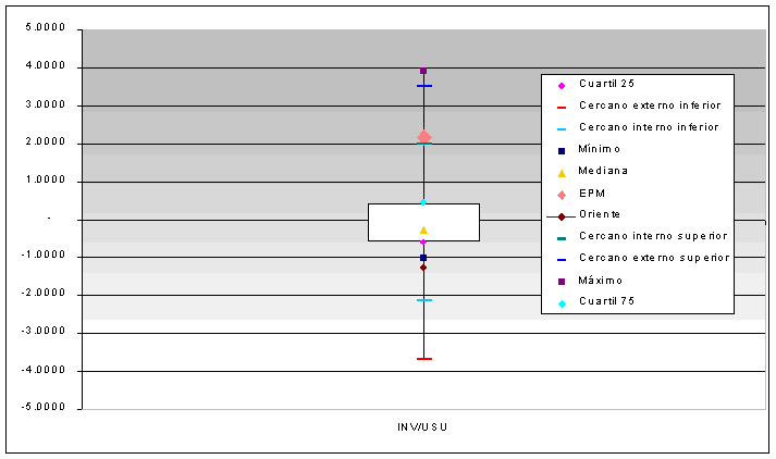 La hipótesis nula de no outliers se rechaza para los índices AOM/USU y INV/USU para la empresa Caucana de gas y se rechaza para el índice INV/RED para la empresa EPM. Como estas dos empresas no dieron outliers en todos los índices calculados, se tomó la decisión de incluirlas en el análisis DEA.