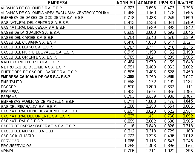 Por otra parte hemos encontrado que se ha utilizado como datos de entrada al modelo DEA datos provenientes de compañías que operan en áreas exclusivas sin que a esas compañías se les haya solicitado dicha información en forma oficial con lo que se distorsionó la validez de esas cifras. Ponemos como ejemplo a Gases del Norte del Valle que de acuerdo con el modelo de la CREG tiene unos Gastos de AOM de 18.000 pesos por usuario, marcando frontera de eficiencia, cuando en realidad esa compañía tiene gastos del orden de 70.000 pesos por usuario con lo cual se afecto negativamente nuestra empresa por un evidente error de calculo.