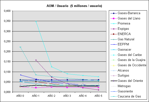 Para realizar la proyección de los gastos AOM, se buscó un mercado de condiciones similares a las que llegaría Gases del Oriente en el largo plazo, usándose como referencia Gas Natural del Oriente en el año 1999. Debido a lo anterior, se estimó un crecimiento gradual de los gastos por usuario promedio hasta llegar al nivel de gastos de referencia. Cabe aclarar, que la compañía cumplió con la proyección de gastos en el año 2003.