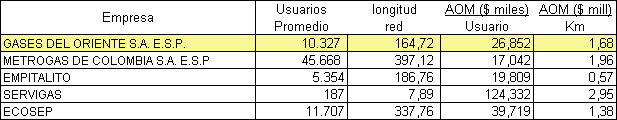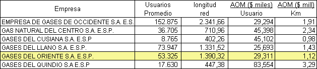 Analizando la información presentada en las Resoluciones expedidas por la CREG para las demás distribuidoras, encontramos que el Valor Presente Neto (VPN) de los gastos de AOM aprobados para algunas de éstas, son superiores a los aprobados para Gases del Oriente, siendo empresas con menor número promedio (para los primeros cinco años) de usuarios y longitudes de red, con respecto a Gases del Oriente; y en otros casos no existe proporción directa entre el VPN de los gastos aprobados frente al número de usuarios y redes tendidas para empresas con mayor mercado que el nuestro, por ejemplo en una de ellas el VPN es seis veces mayor al aprobado para Gases del Oriente y los usuarios no alcanzan a ser tres veces el de nuestro mercado, con igual número de Km. de red tendida.
