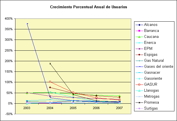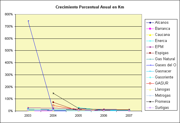 A continuación se presenta el comportamiento de crecimiento porcentual anual de usuarios y kilómetros de red de empresas nuevas y existentes: El comportamiento de Gases del Oriente se asemeja a las empresas nuevas en su primer año de operación, lo que valida el tratamiento de empresa nueva para Gases del Oriente.