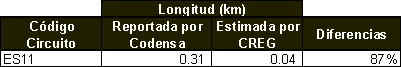 De lo anterior se concluye que en cuanto a la longitud de los circuitos, para los cuales se tiene información de longitud, la información reportada por Codensa no coincide con lo identificado por la CREG en la visita de campo para el 80.95% de los circuitos. Teniendo en cuenta que el error muestral es 7.45% Esto es, debido a que de los 28 circuitos sólo se visitaron 23 de ellos., se concluye que la información de longitudes reportada por Codensa para los circuitos con red subterránea tiene un rango de incertidumbre entre el 73.5% y el 88.4%.