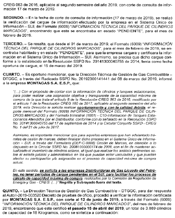 “1. PRIMERO: De acuerdo con lo resolución CREG 048 de 2019 donde se define la máxima capacidad de compra para el segundo semestre de 2019, se asignó a Montagas SA ESP la cantidad de 26.284.382 kilos; La información de activos de la empresa fue tomada con corte al mes de marzo de 2019, situación que no contempla una gran cantidad de cilindros que la empresa adquirió durante los primeros meses del año 2019 y que por causas ajenas a la operación de la empresa, y por la afectación del bloqueo de vías en el departamento del Cauca, dichos cilindros no pudieron ser entregados por el proveedor en su totalidad, para ser certificados en el sistema único de información SUI.