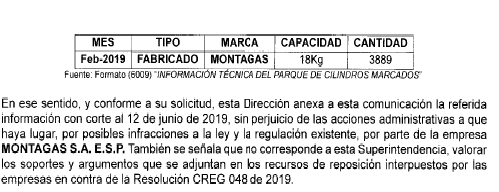 En respuesta al auto de pruebas mediante comunicación 20192300451841 radicado CREG E-2019-006581, la Superintendencia de Servicios Públicos Domiciliarios expuso lo siguiente parta el caso de la empresa Montagas:
